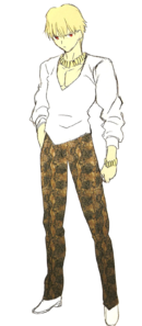 Gilgamesh (ギルガメッシュ, Girugamesshu), also known as Archer (アーチャー, Āchā), is the Archer-class Servant of Tokiomi Tohsaka in the Fourth Holy Grail War of Fate/Zero. He later forms a new contract with Kirei Kotomine that lasts ten years later into the time of the Fifth Holy Grail War of Fate/stay night. He has an obsession with Saber during both stories.